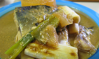 焼きネギ、大根が入ったサバ味噌煮。