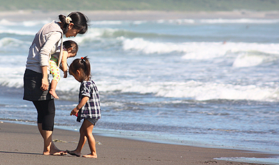 パパの波乗りを待つファミリー。