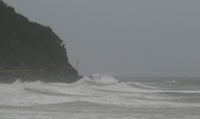 道中は暴風雨の中、海沿いの道を走り抜けると