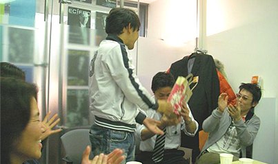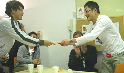 編集長のKicksに皆からプレゼント贈呈。