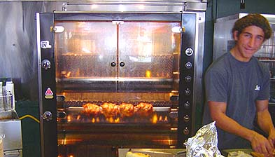 オーブンで焼かれるチキン、隣にいるのは友達のクリス。